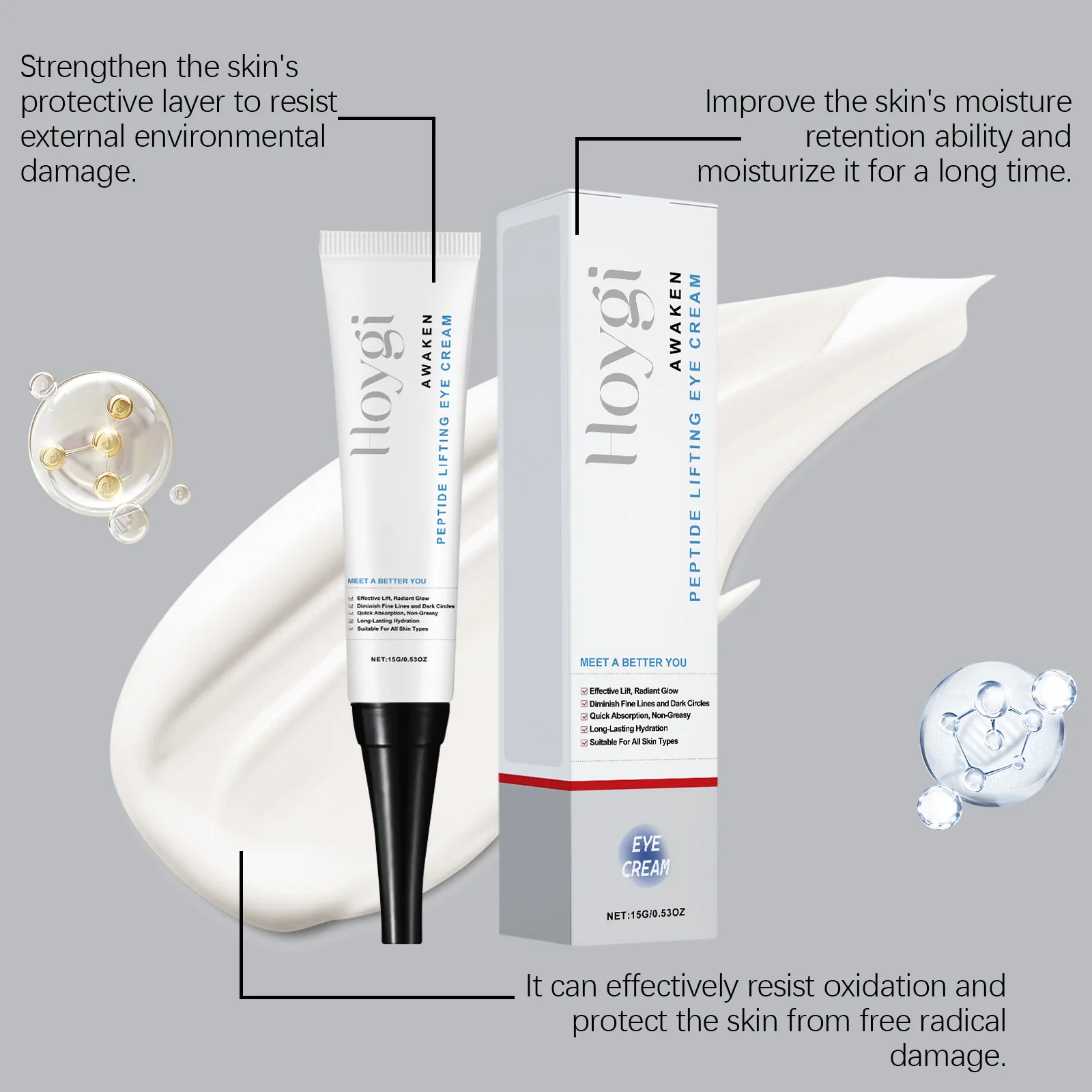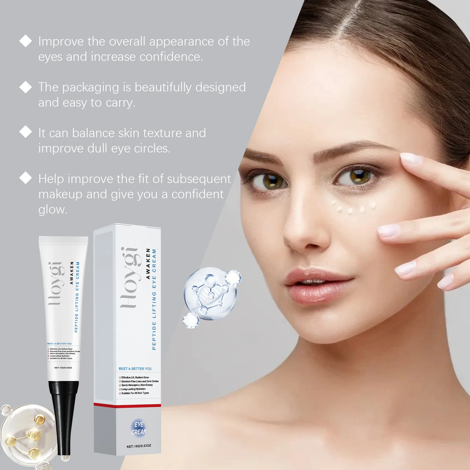 1.Deep hydration: Formulated with hydrating peptides, this eye cream deeply nourishes the delicate skin around the eyes, reducing puffiness and dark circles for a brighter, refreshed appearance.