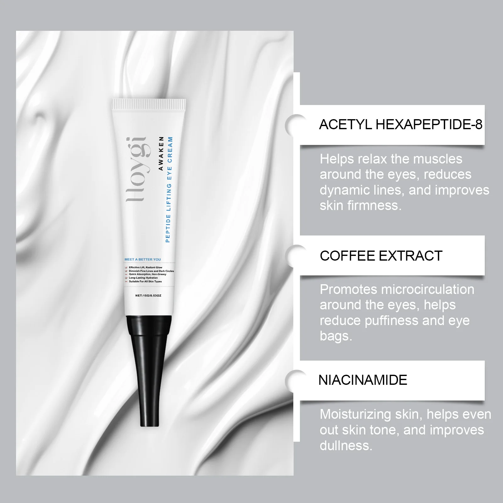 4.Brightening effects: Infused with brightening peptides, it helps to fade dark circles and discoloration, revealing a brighter, more even-toned eye area.